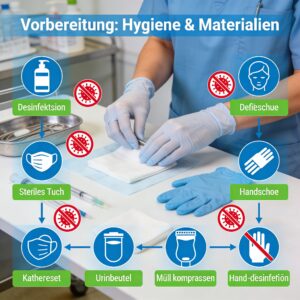 Vorbereitung, Hygiene und Material Eine sorgfältige Vorbereitung ist die Grundlage für einen sicheren Katheterismus. Sie schützt sowohl die Patientin bzw. den Patienten als auch dich selbst. !!!!Vor Beginn der Katheterisierung sind folgende Schritte erforderlich: 1. Information der Patientin/des Patienten über die Maßnahme 2. Einholen der Einwilligung 3. Wahrung der Intimsphäre (Sichtschutz, ruhige Umgebung) 4. Rückenlagerung mit leicht angezogenen und gespreizten Beinen 5. hygienische Händedesinfektion 6. Materialvorbereitung 7. Zu den benötigten Materialien gehören: 8. steriles Katheterset 9. sterile Handschuhe (bei Männern idealerweise zwei Paar) 10. Schleimhautdesinfektionsmittel 11. steriles Gleitmittel 12. ca. 6 ml bei Frauen 13. ca. 10–11 ml bei Männern 14. geeigneter Katheter (z. B. Nelaton oder Tiemann) 15. Blockerspritze 16. Urindrainagesystem Merkkasten Hygiene Unterbrechungen während der Katheterisierung erhöhen das Kontaminationsrisiko.
