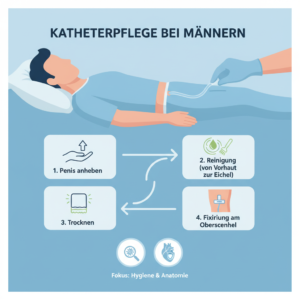 Katheterisierung beim Mann Die männliche Harnröhre ist mit etwa 20–25 cm deutlich länger als die weibliche und weist mehrere physiologische Krümmungen auf. Dies erfordert ein besonders vorsichtiges und geduldiges Vorgehen. Durchführung beim Mann Zwei Paar sterile Handschuhe werden vorbereitet. Die Vorhaut wird vollständig zurückgestreift. Glans penis und Harnröhrenöffnung werden sorgfältig desinfiziert. Gleitmittel wird ohne Druck in die Harnröhre instilliert. Der Penis wird gestreckt, um die Harnröhrenkrümmung auszugleichen. Der Katheter (z. B. Tiemann, Spitze auf 12 Uhr) wird vorsichtig vorgeschoben. Bei Urinfluss wird der Katheter weiter vorgeschoben und der Ballon geblockt. Die Vorhaut wird wieder zurückgeschoben, um eine Paraphimose zu vermeiden. Achtung! Niemals Gewalt anwenden – Widerstand ist ein Warnsignal.